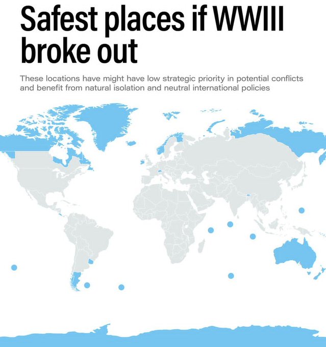 Die sichersten Orte der Welt im Falle eines Ausbruchs des Dritten Weltkriegs 1. Antarktis 2. Neuseeland 3. Island 4. Grönland 5. Fidschi 6. Tuvalu 7. Argentinien (Region Südpatagonien) 8. Chile (Region Südpatagonien) 9. Mauritius 10. Andere abgelegene Inseln im Pazifik/Indischen Ozean (verschiedene kleine Nationen/Gebiete) Hinweis: Diese Standorte werden hauptsächlich aufgrund ihrer extremen geografischen Isolation, ihres geringen strategischen Werts und ihres oft neutralen oder blockfreien Status ausgewählt.